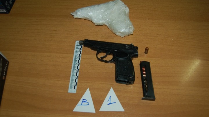 - Επιμελώς κρυμμένα σε μεταλλική επιφάνεια σε κοινόχρηστο χώρο: Πιστόλι με γεμιστήρα 6 φυσιγγίων, μαχαίρι και αυτοσχέδια νάιλον συσκευασία με ναρκωτική ουσία, πιθανόν ηρωίνη, σε μορφή βράχου, συνολικού μικτού βάρους 9,1 γραμμαρίων.